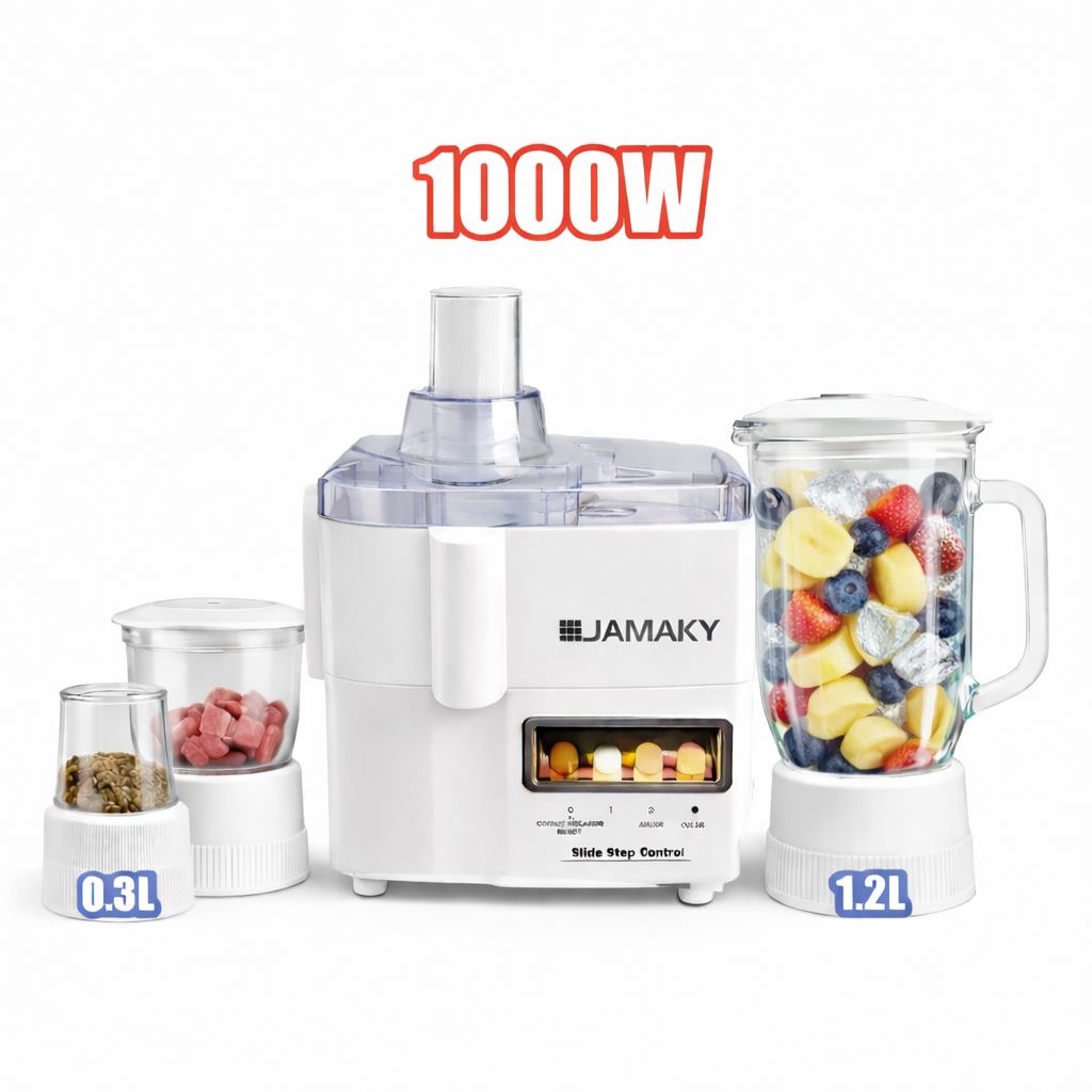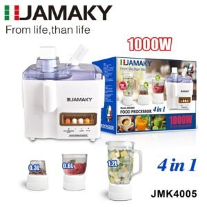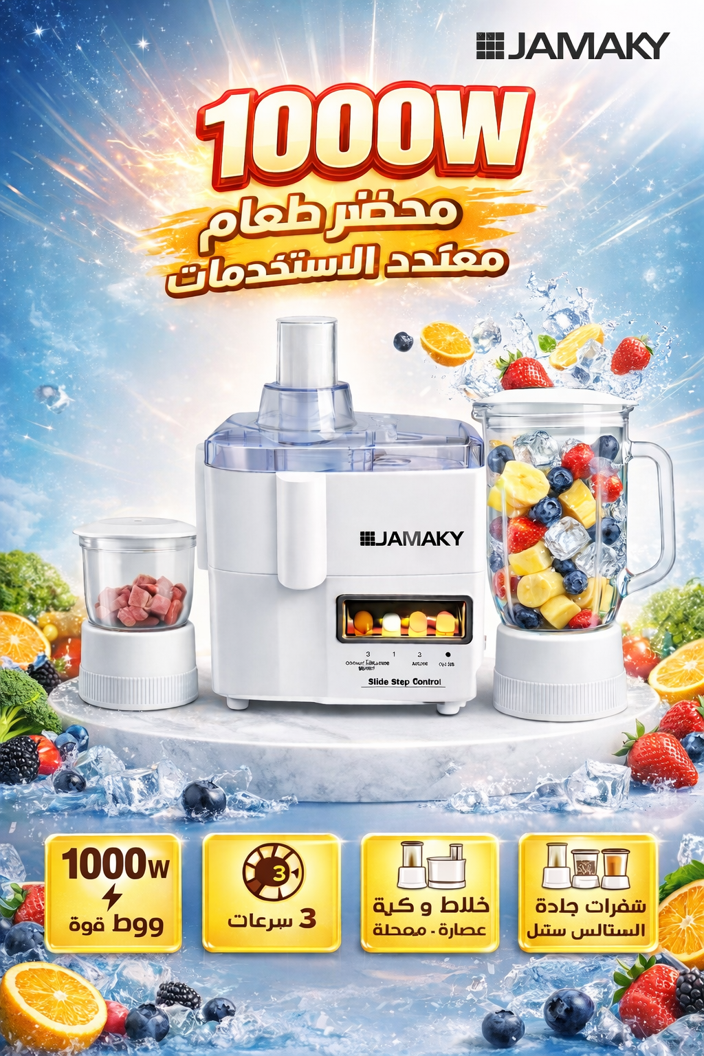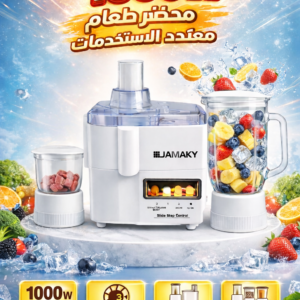 محضر الطعام JAMAKY 1000 وات هو الحل العملي والمتكامل لمطبخك، جهاز 4 في 1 يجمع كل اللي تحتاجه في جهاز واحد: