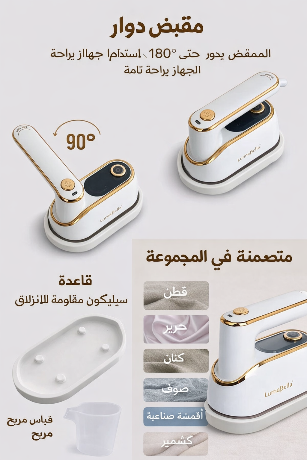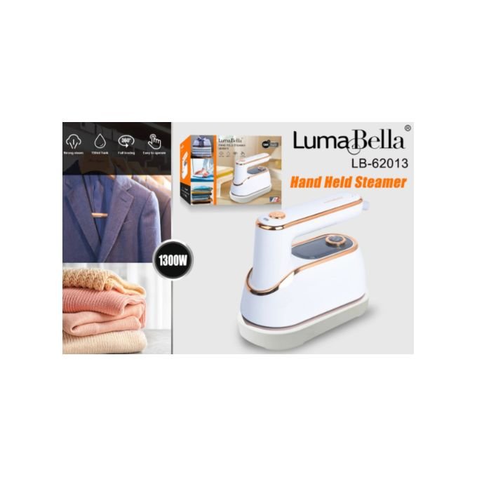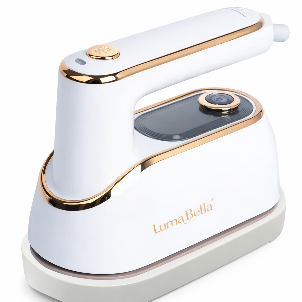 مكواة البخار اليدوية Lumabella تجمع بين الفخامة والأداء القوي في تصميم أنيق باللون الأبيض مع لمسات ذهبية راقية. صممت لتمنحك كي سريع وسهل بدون الحاجة إلى طاولة كي، وتناسب الاستخدام في البيت، السفر، والمواقف الطارئة.